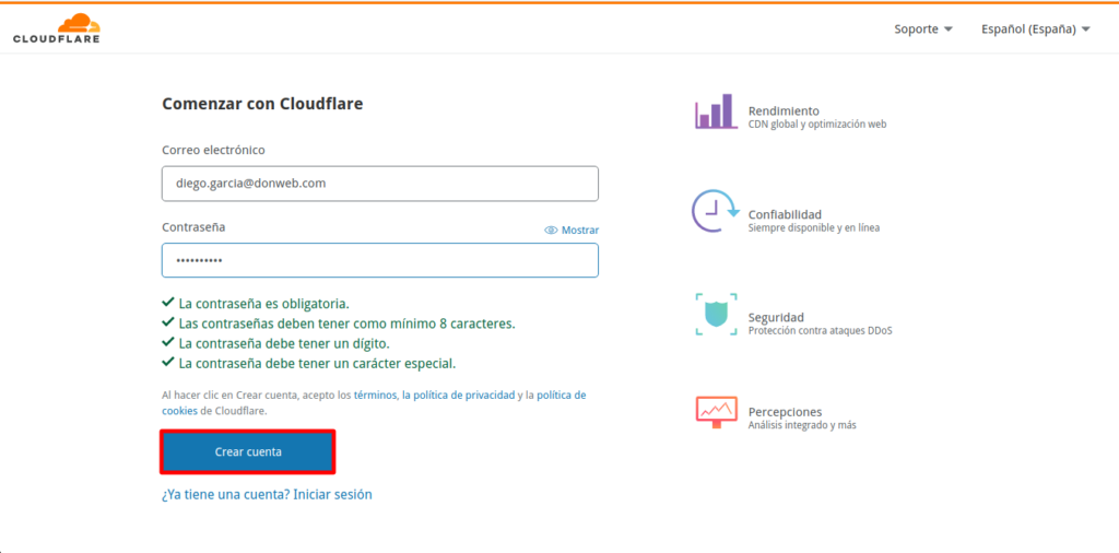 - Para crear una cuenta en CloudFlare, haz clic aquí. Completa la dirección de correo electrónico y contraseña, luego presiona el botón «Crear cuenta».