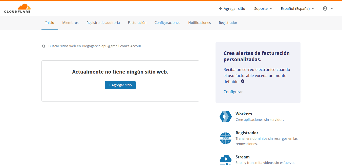 Una vez que hayas verificado la cuenta, podrás acceder al menú del panel de CloudFlare.