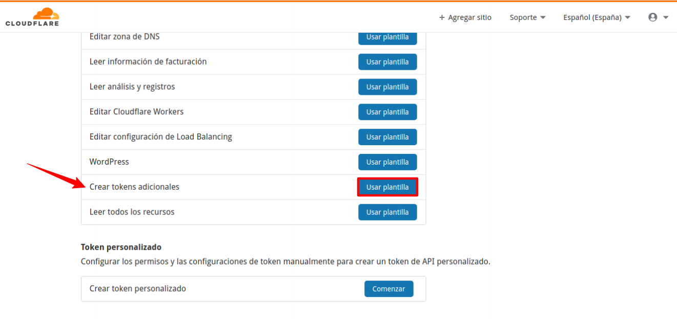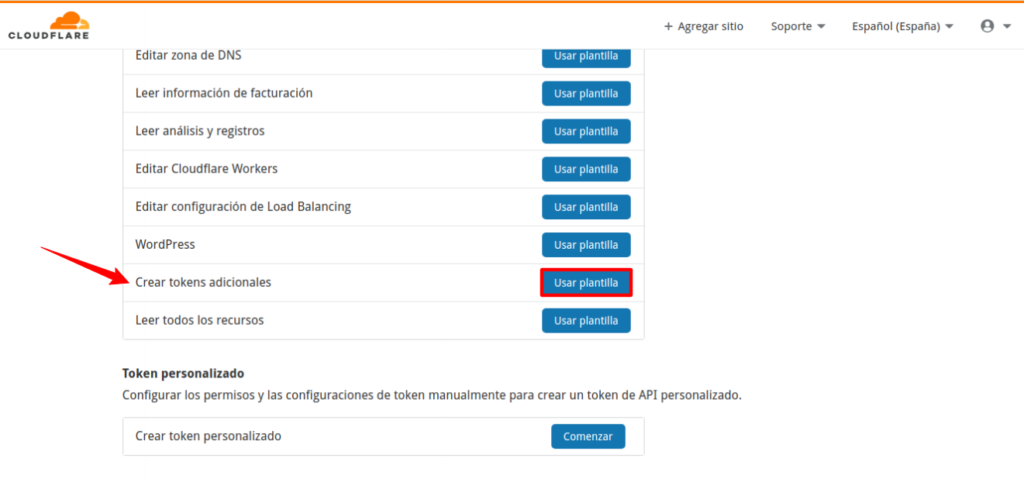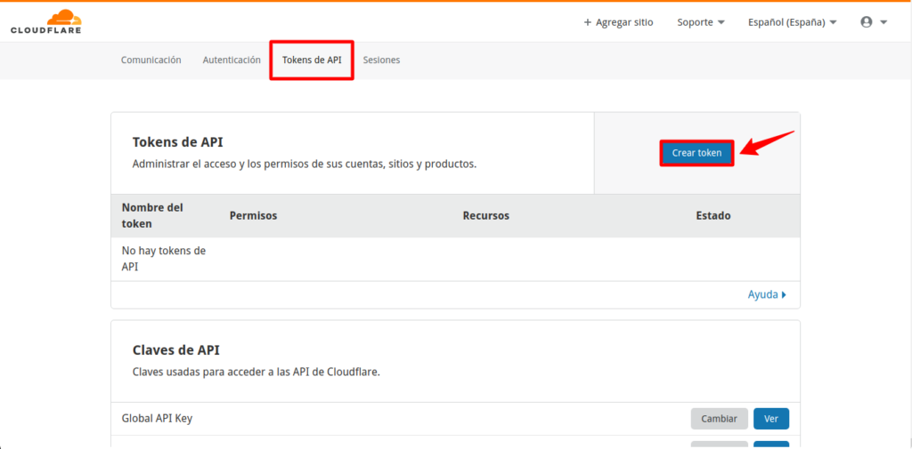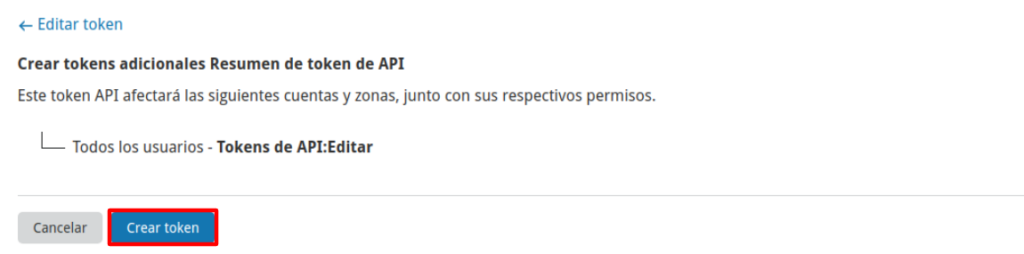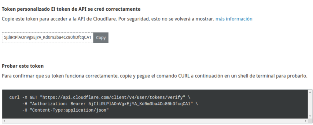 En la nueva pantalla, haz clic en el botón que dice «Crear token» para que CloudFlare nos muestre el token generado