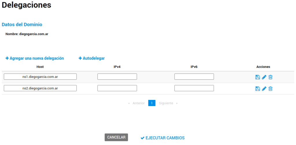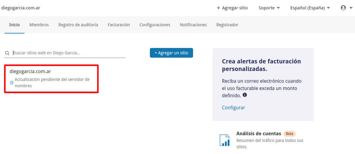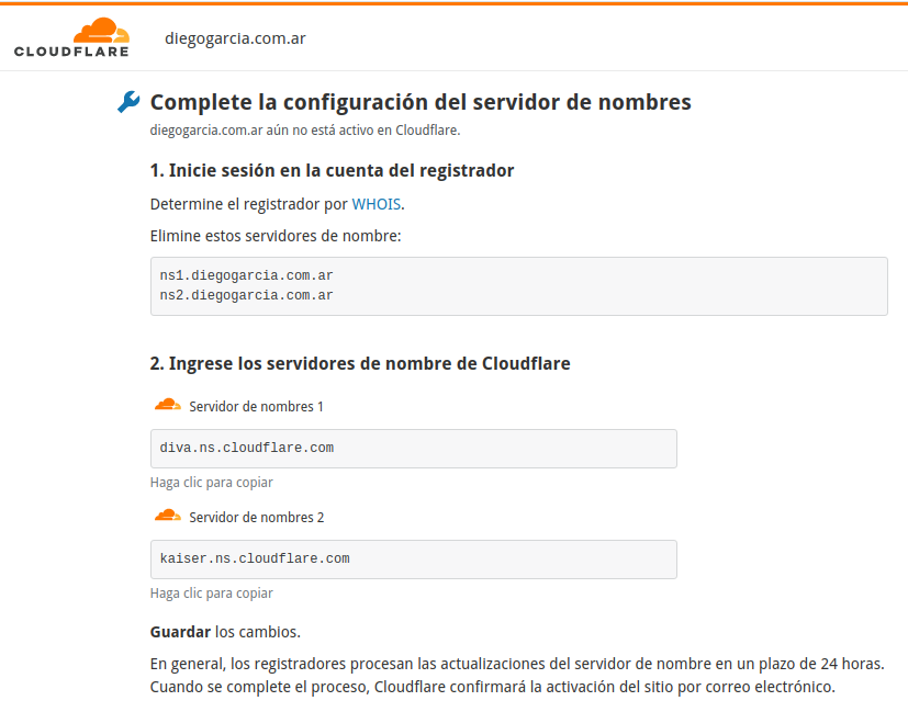 Todas las acciones o seteos de configuración que realicemos quedarán en un estado «pendiente» hasta que deleguemos los NS a los de CloudFlare. Esto debes realizarlo desde entidad registrante del dominio, cambiar los NS actuales por los que nos proporciona CloudFlare.