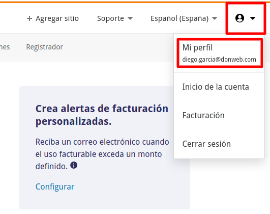El API Token de CloudFlare nos permite vincular la cuenta al panel de hosting Ferozo. Para obtenerlo, haz clic en el icono, que está arriba a la derecha, y luego presiona «Mi perfil».