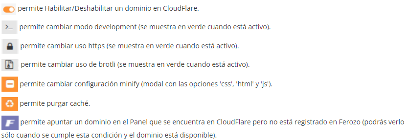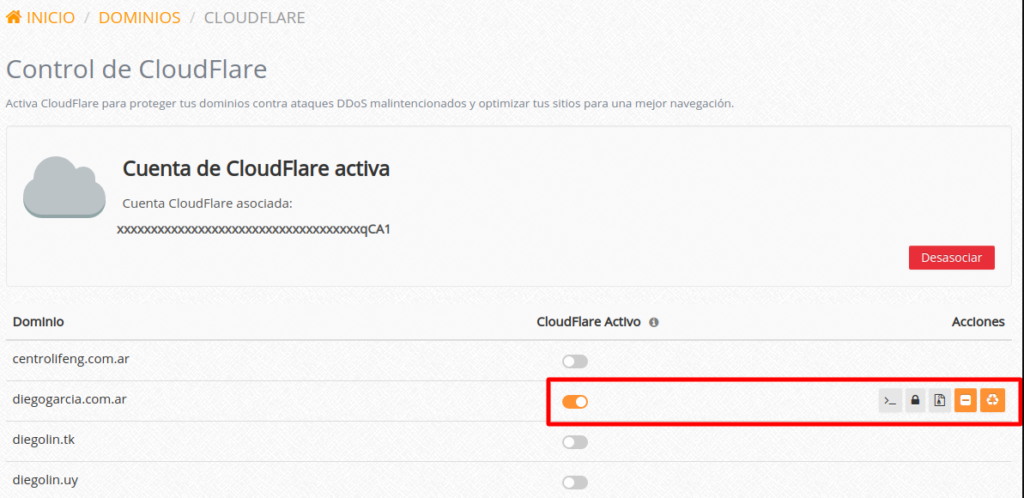 Para habilitar o agregar un dominio en CloudFlare desde Ferozo, debemos hacer click en el switch de la fila correspondiente de la columna «CloudFlare Activo» y se habilitarán las acciones que podemos realizar sobre éste: