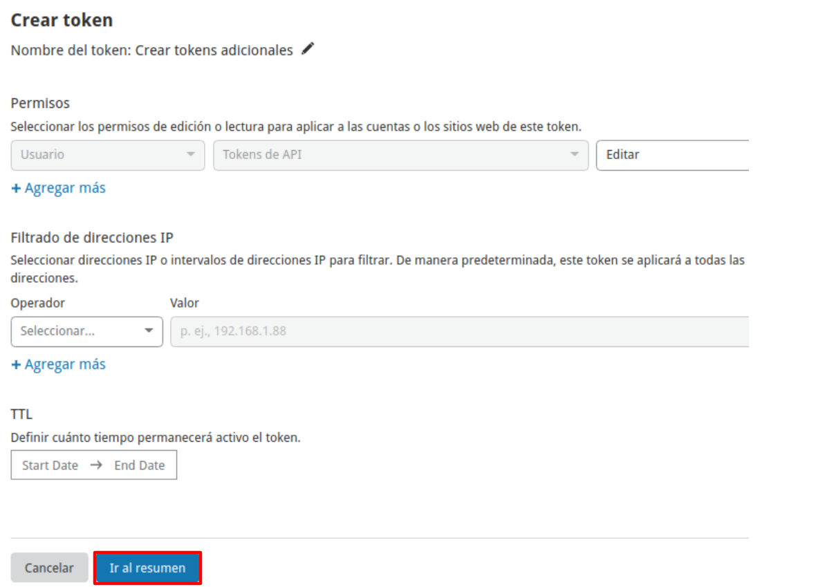 En la nueva pantalla, haz clic en «Tokens de API» y luego presiona el botón «Crear token».